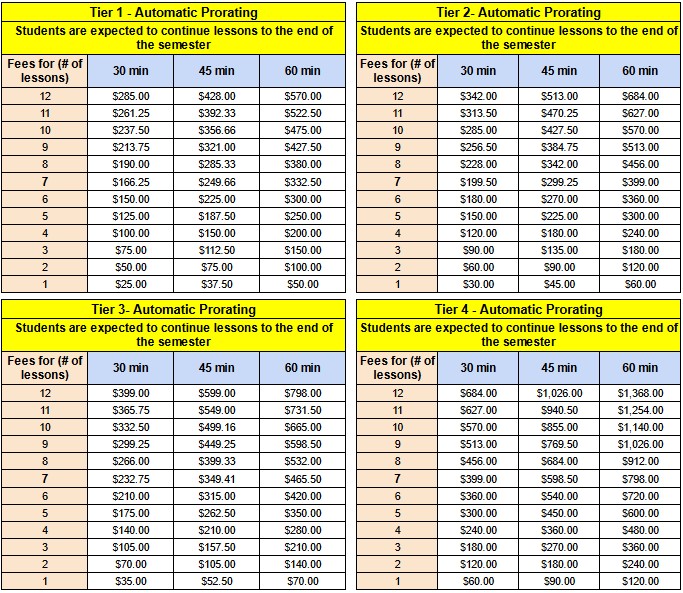 Prorating: If private lesson registrations come in after the start of the semester, they will be prorated to reflect a lower number of lessons. Therefore, the fees will mathematically reflect fewer lessons. Our program is semester based and we do not accept registrations for less then the full semester (exceptions for trial lesson and late start in the semester).