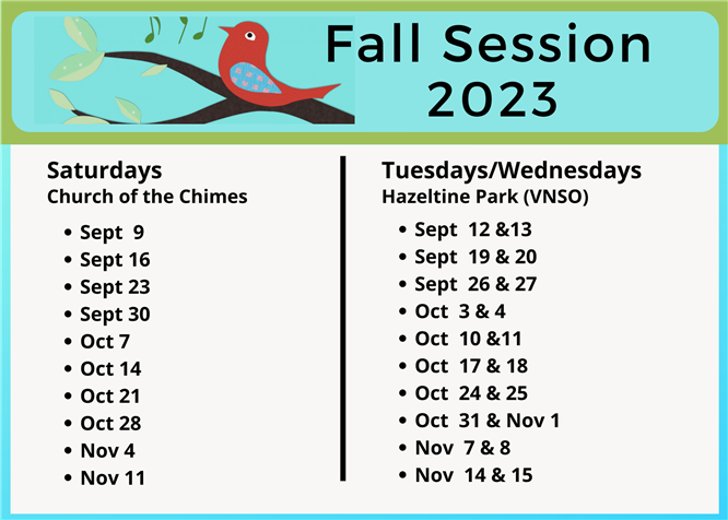 We have classes in VNSO Park (Hazeltine Park) on weekday mornings and on the grounds of the Church of the Chimes on Saturday mornings