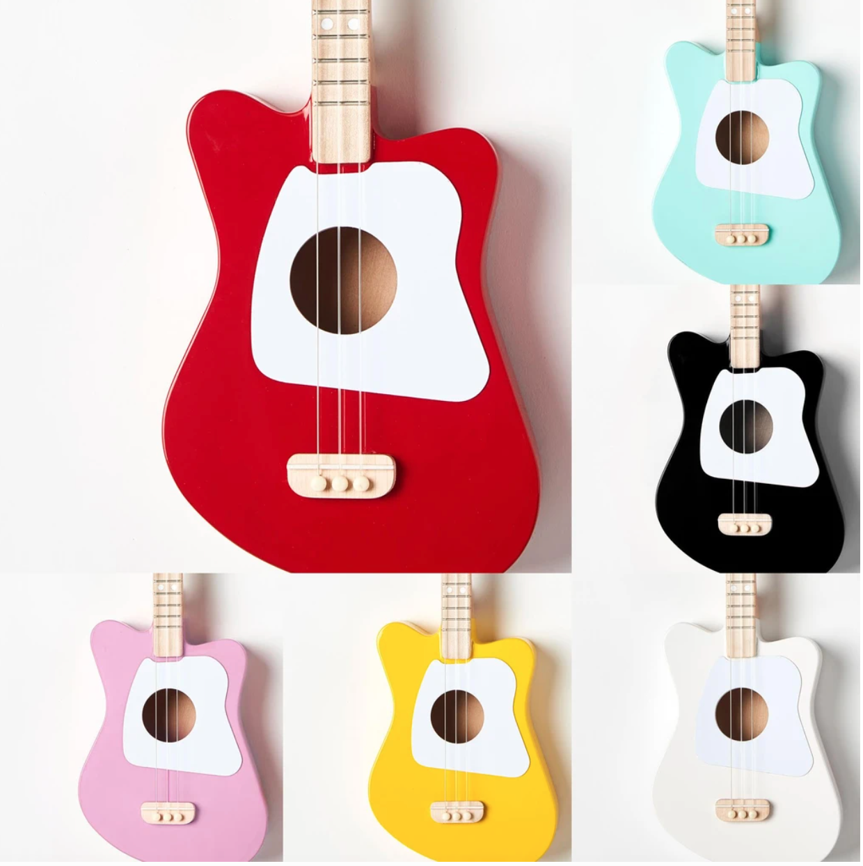 The Loog Mini is the perfect first guitar. Loog guitars use the first three strings of a guitar: same strings, same tuning. So everything you learn on a Loog can be applied on a 6-string guitar too. All Loog Minis come bundled with chord-learning flashcards and a free app that has a tuner, digital songbook and more!