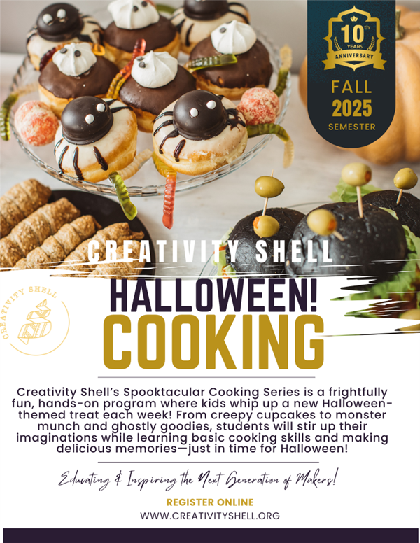 Halloween Cooking!! The Creativity Shell’s Spooktacular Cooking Series is a frightfully fun, hands-on program where kids whip up a new Halloween-themed treat each week! From creepy cupcakes to monster munch and ghostly goodies, students will stir up their imaginations while learning basic cooking skills and making delicious memories—just in time for Halloween!