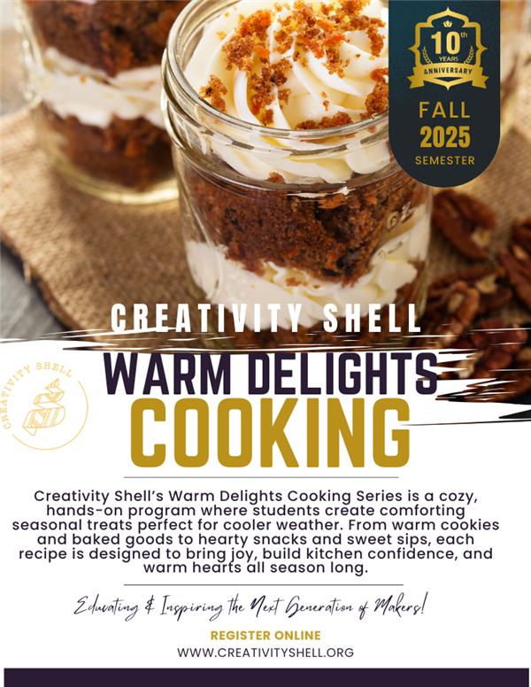 Warm Delights! The Creativity Shell’s Warm Delights Cooking Series is a cozy, hands-on program where students create comforting seasonal treats perfect for cooler weather. From warm cookies and baked goods to hearty snacks and sweet sips, each recipe is designed to bring joy, build kitchen confidence, and warm hearts all season long.
