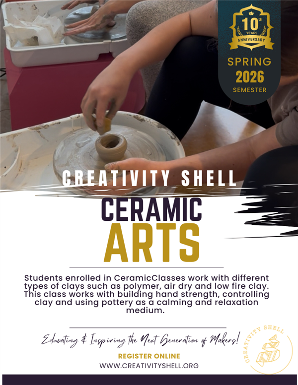 Students enrolled in the beginner pottery classes at the Creativity Shell will learn to create using a variety of different types of clays such as polymer, air dry and low fire kiln clay. Students will also learn to use a pottery wheel and how to paint/glaze some of the items they are working on.