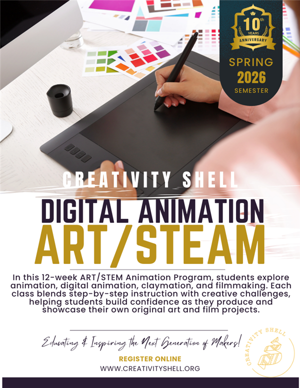 In this 12-week ART/STEM Animation Program, students explore animation, digital animation, claymation, and filmmaking. Each class blends step-by-step instruction with creative challenges, helping students build confidence as they produce and showcase their own original art and film projects.
