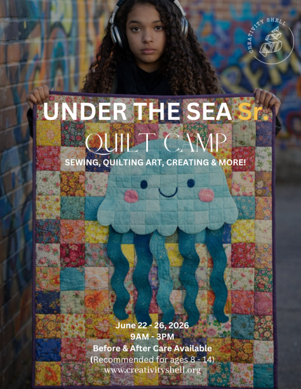 Designed for senior and more advanced sewing students, this camp invites participants to design and construct a 48" x 48" quilt inspired by a creature from under the sea. From bold sea turtles and graceful jellyfish to imaginative deep-sea creations, students will bring their vision to life through fabric selection, layout, and detailed construction.