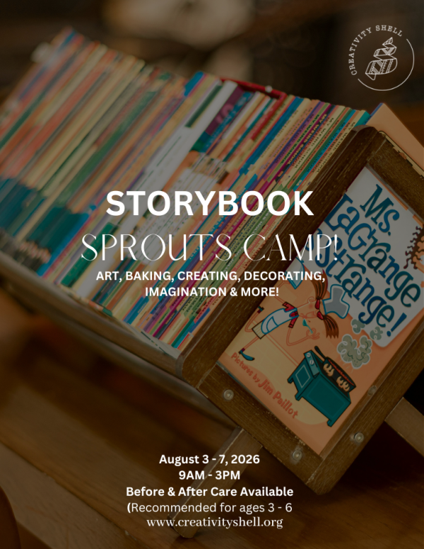 Get ready to turn the page on a week full of creativity and wonder. Storybook Sprouts Camp invites our Sprouts to step inside the magical world of books as stories come to life through art, play, and imagination. This camp is a Creativity Shell favorite, hosted each year during the final week of Summer Camps and cherished by campers and families alike.
