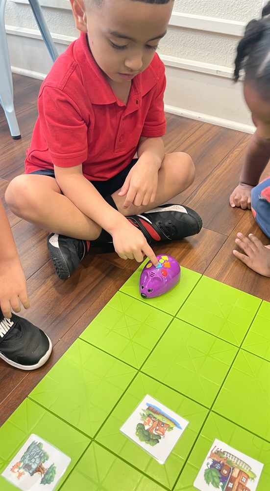 Pretending to be dinosaurs! Standing on a faux dino footprint. This lesson was about how big dinosaurs were.