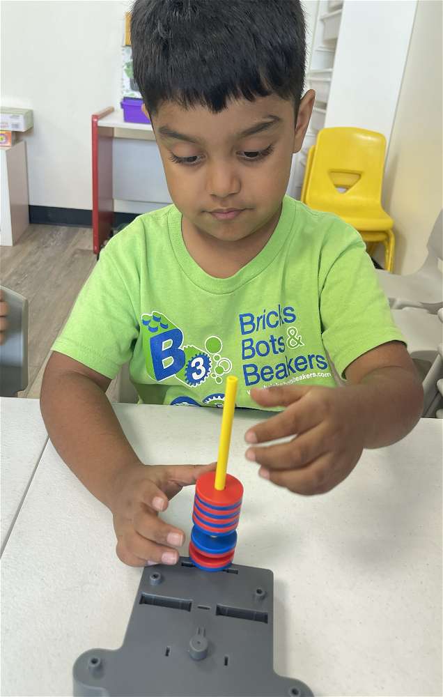Playing "Dizzy Builder" with Tipster. Stacking as many items (mini robots) on Tipster's ladders before we program him to spin. How many items stayed on?