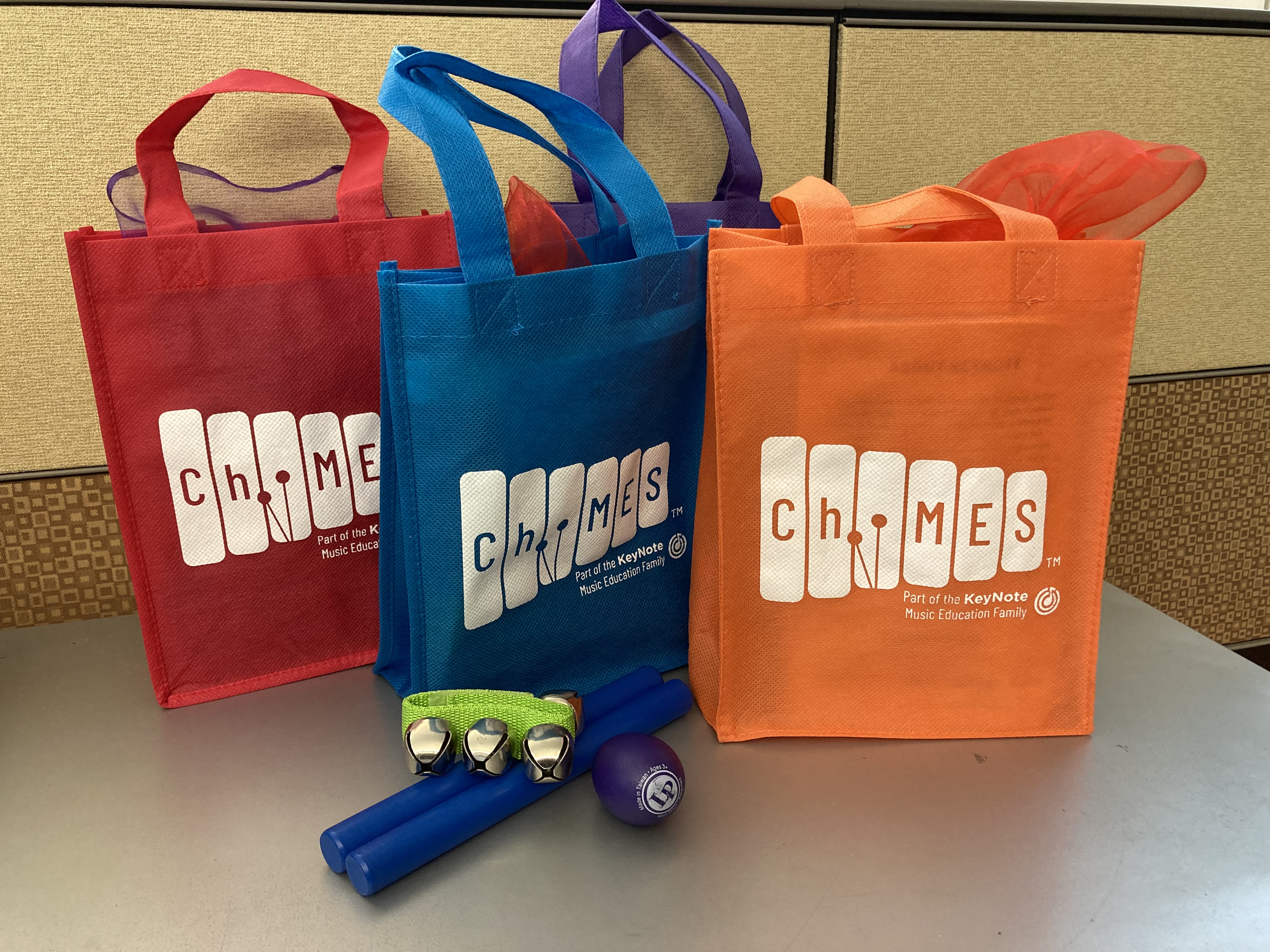 Our ChIMES instrument kit includes a set of rhythm sticks, an egg shaker, a scarf, and a session songbook, all contained in a colorful, reusable ChIMES bag.